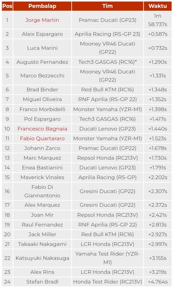 Jorge Martin membukukan catatan waktu 1 menit 58,787 detik pada putaran ke-21. Terpaut selisih 0,997 dari rekor lap yang dibukukannya tahun lalu.